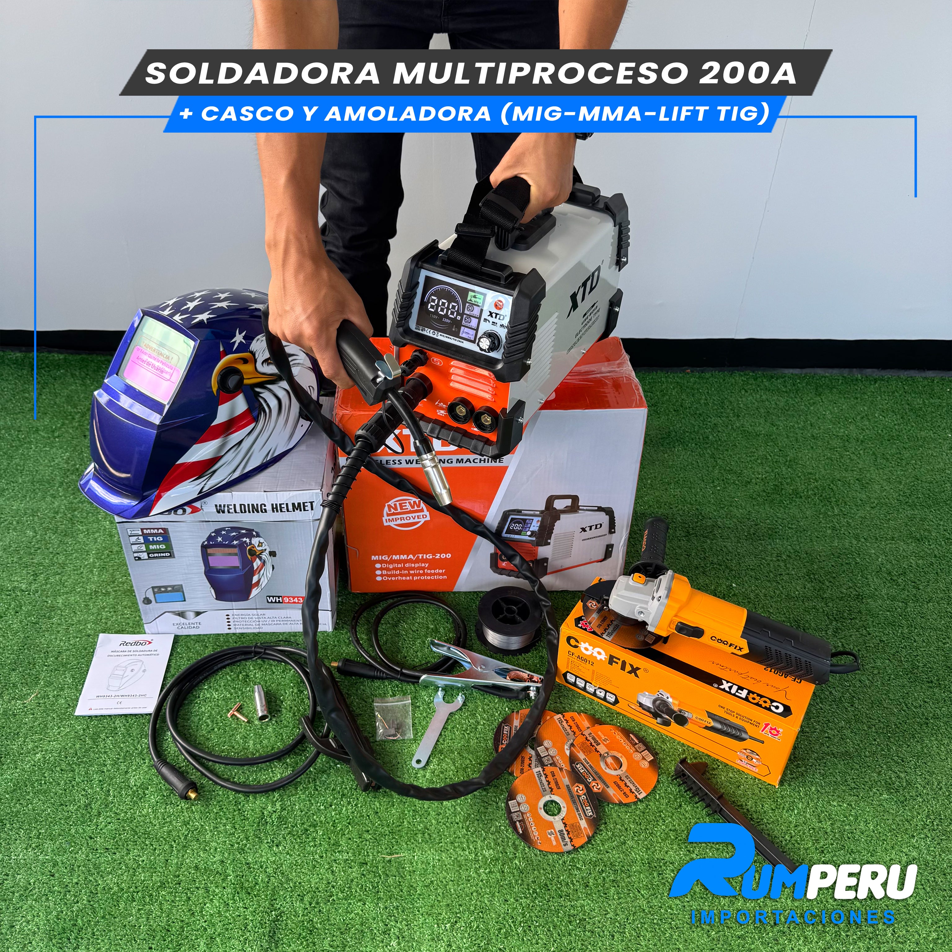 SOLDADORA MULTIPROCESO 200 APERIOS + CASCO Y AMOLADORA