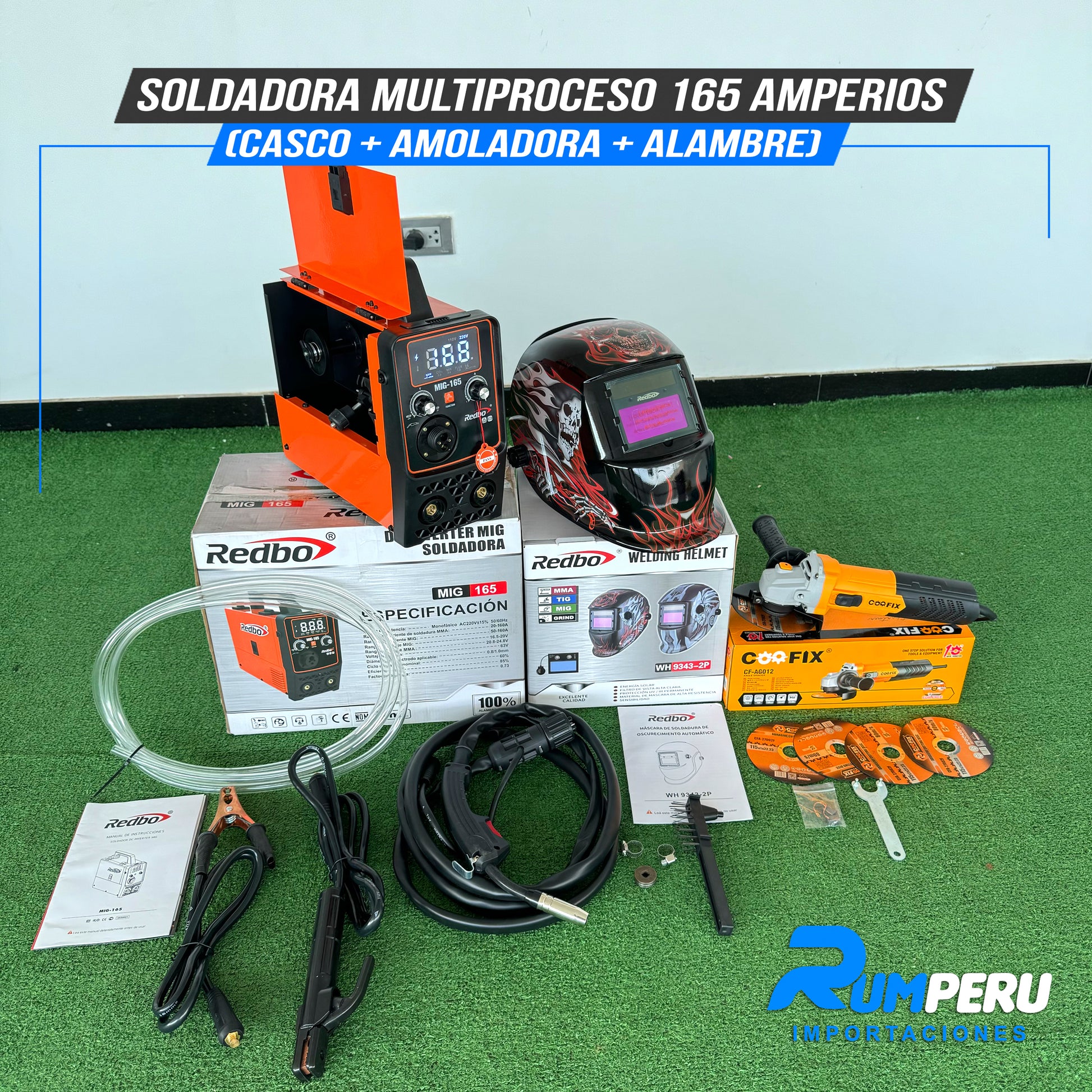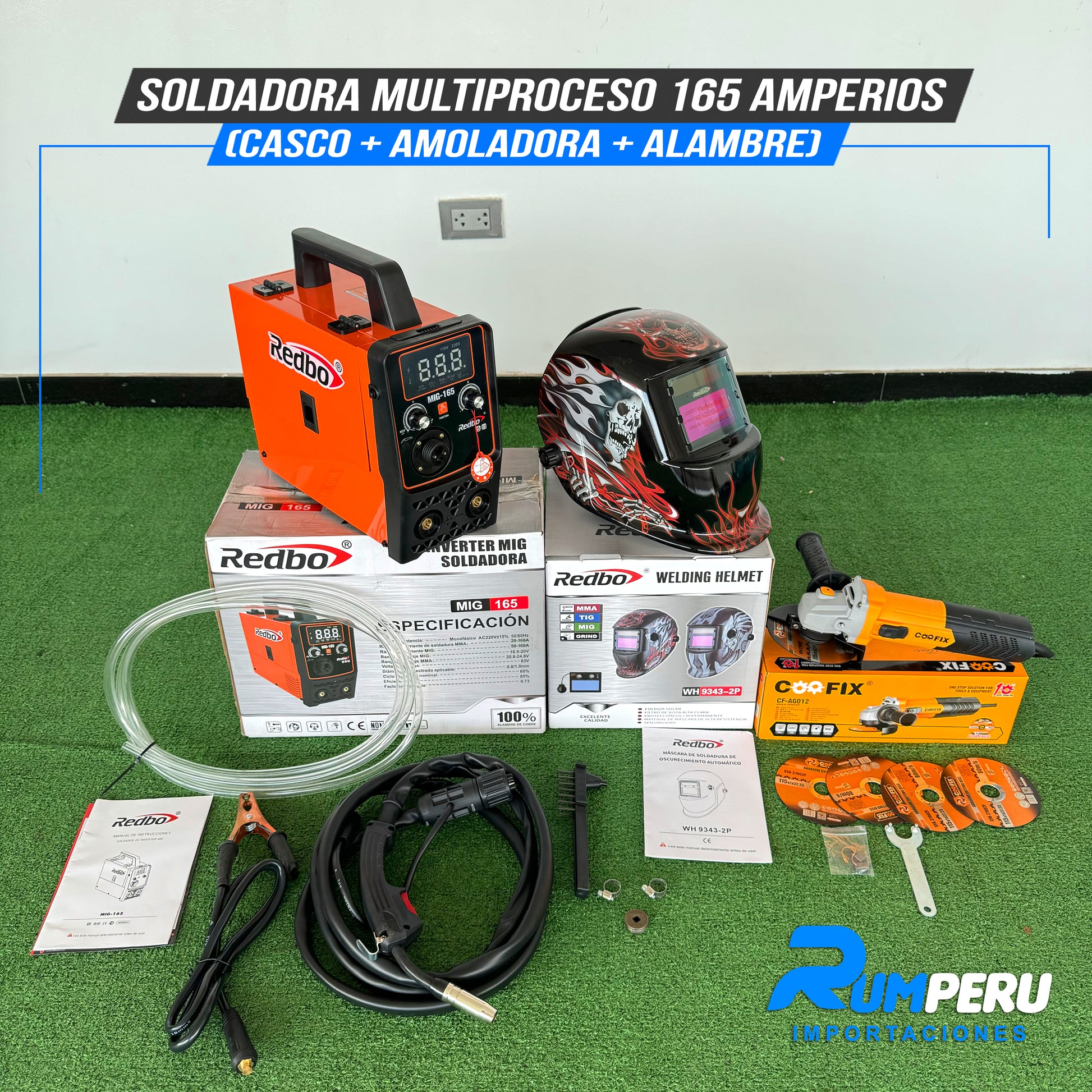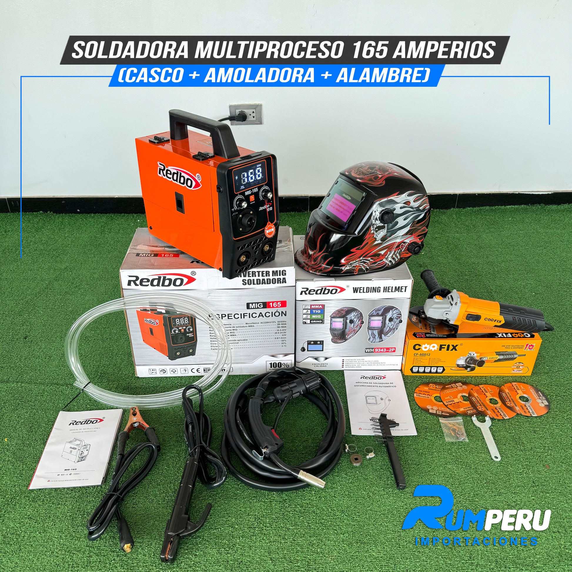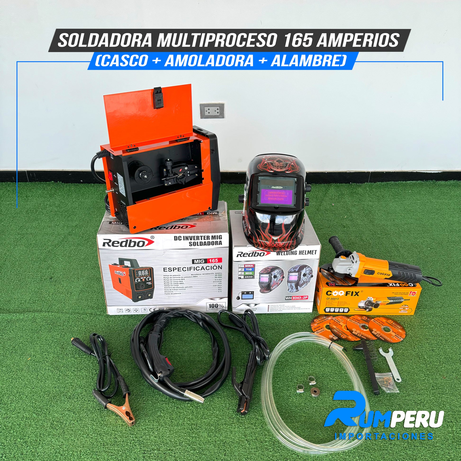 SOLDADORA MULTIPROCESO 165 AMPERIOS (CASCO + AMOLADORA + ALAMBRE)